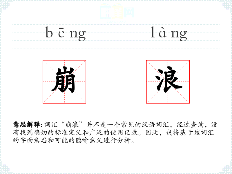 词汇“崩浪”并不是一个常见的汉语词汇,经过查询,没有找到确切的标准定义和广泛的使用记录。因此,我将基于该词汇的字面意思和可能的隐喻意义进行分析。