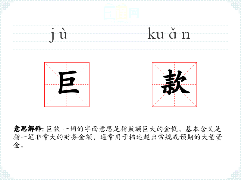 巨款 一词的字面意思是指数额巨大的金钱。基本含义是指一笔非常大的财务金额,通常用于描述超出常规或预期的大量资金。