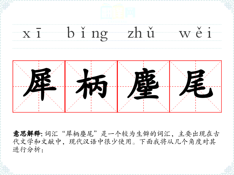 词汇“犀柄麈尾”是一个较为生僻的词汇,主要出现在古代文学和文献中,现代汉语中很少使用。下面我将从几个角度对其进行分析: