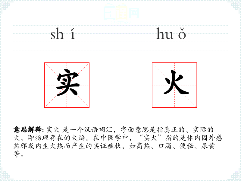 在英语中,没有直接对应“实火”的词汇,但可以用“real fire”来描述物理上的火焰,用“excessive heat”或“internal heat”来描述中医中的实火症状。
