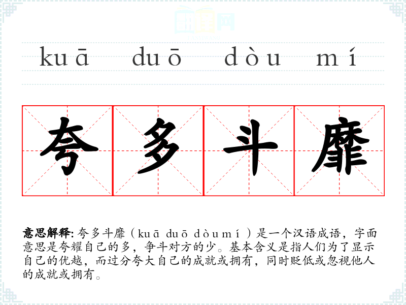 夸多斗靡(kuā duō dòu mí)是一个汉语成语,字面意思是夸耀自己的多,争斗对方的少。基本含义是指人们为了显示自己的优越,而过分夸大自己的成就或拥有,同时贬低或忽视他人的成就或拥有。