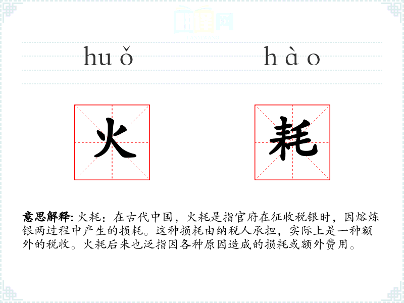火耗:在古代中国,火耗是指官府在征收税银时,因熔炼银两过程中产生的损耗。这种损耗由纳税人承担,实际上是一种额外的税收。火耗后来也泛指因各种原因造成的损耗或额外费用。