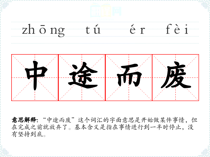 “中途而废”这个词汇的字面意思是开始做某件事情,但在完成之前就放弃了。基本含义是指在事情进行到一半时停止,没有坚持到底。
