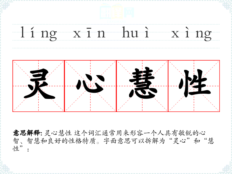 灵心慧性 这个词汇通常用来形容一个人具有敏锐的心智、智慧和良好的性格特质。字面意思可以拆解为“灵心”和“慧性”: