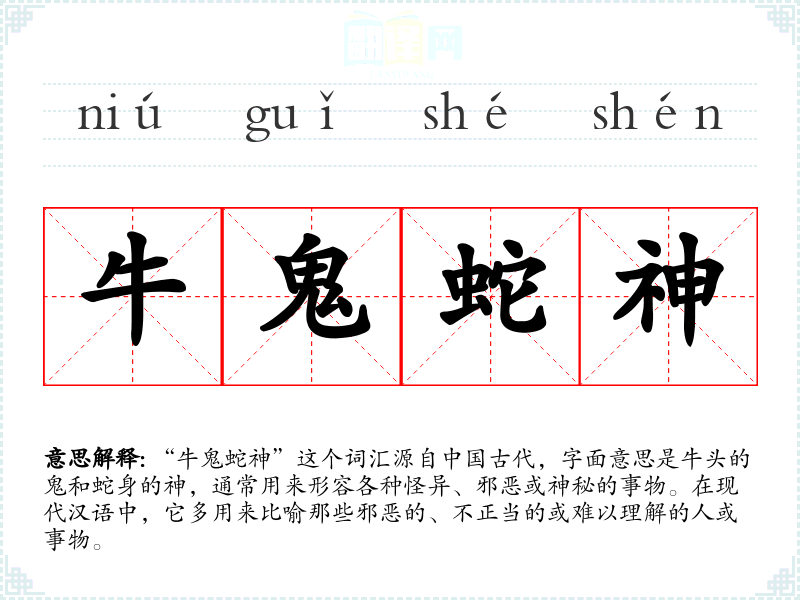 “牛鬼蛇神”这个词汇源自**古代,字面意思是牛头的鬼和蛇身的神,通常用来形容各种怪异、邪恶或神秘的事物。在现代汉语中,它多用来比喻那些邪恶的、不正当的或难以理解的人或事物。