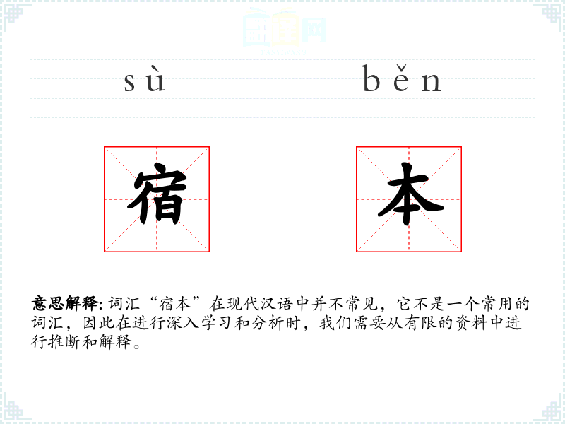 词汇“宿本”在现代汉语中并不常见,它不是一个常用的词汇,因此在进行深入学习和分析时,我们需要从有限的资料中进行推断和解释。