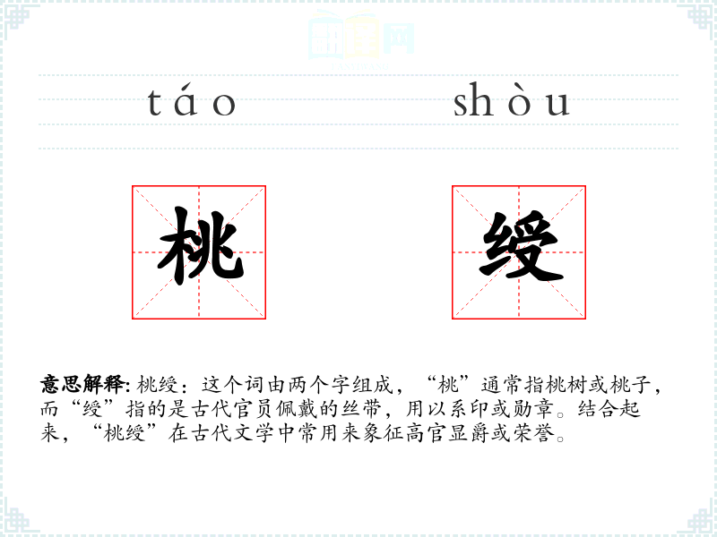 桃绶:这个词由两个字组成,“桃”通常指桃树或桃子,而“绶”指的是古代官员佩戴的丝带,用以系印或勋章。结合起来,“桃绶”在古代文学中常用来象征高官显爵或荣誉。