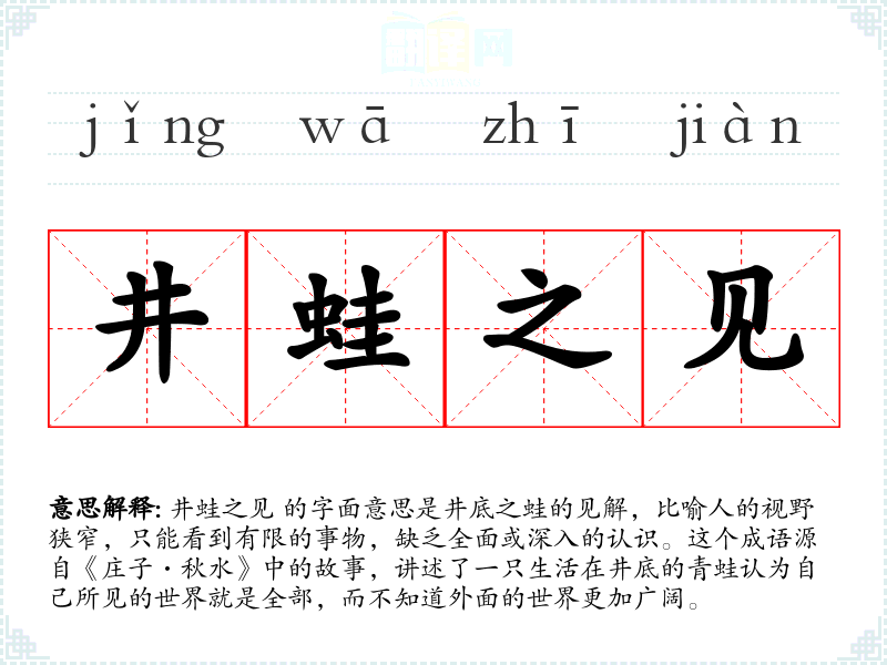 井蛙之见 的字面意思是井底之蛙的见解,比喻人的视野狭窄,只能看到有限的事物,缺乏全面或深入的认识。这个成语源自《庄子·秋水》中的故事,讲述了一只生活在井底的青蛙认为自己所见的世界就是全部,而不知道外面的世界更加广阔。