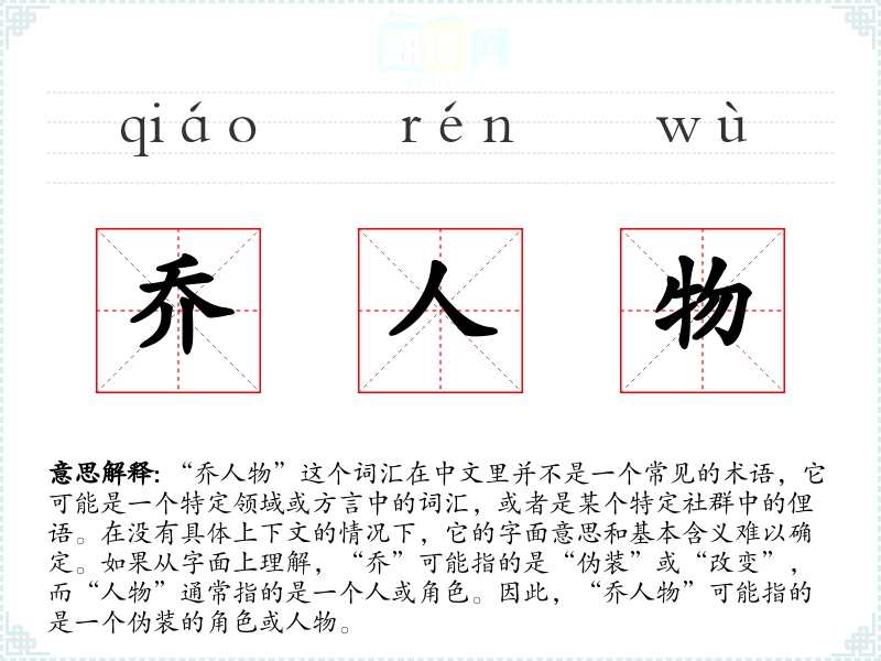 由于“乔人物”不是一个广泛认知的词汇,它在不同语境下的使用可能非常有限。在某些特定的文学作品或口语中,它可能被用来描述一个伪装的角色,或者在某些专业领域中,它可能有特定的含义。