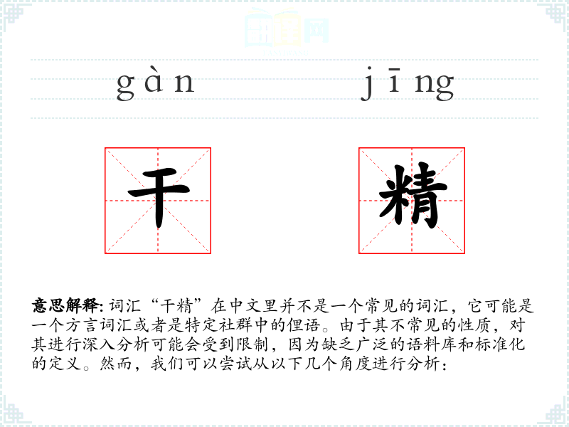 由于“干精”不是一个标准的中文词汇,我们无法提供一个确切的字面意思和基本含义。它可能是某个地区或社群中用来形容某人精明、能干或者狡猾的词汇。