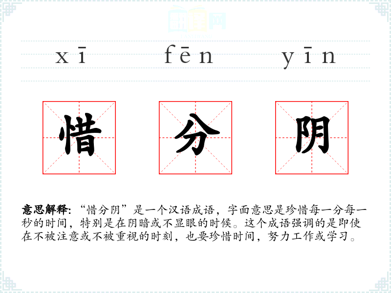 “惜分阴”是一个汉语成语,字面意思是珍惜每一分每一秒的时间,特别是在阴暗或不显眼的时候。这个成语强调的是即使在不被注意或不被重视的时刻,也要珍惜时间,努力工作或学*。