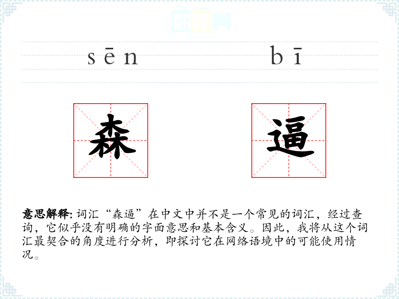 词汇“森逼”在中文中并不是一个常见的词汇,经过查询,它似乎没有明确的字面意思和基本含义。因此,我将从这个词汇最契合的角度进行分析,即探讨它在网络语境中的可能使用情况。