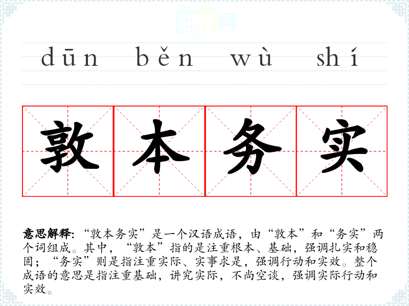 “敦本务实”是一个汉语成语,由“敦本”和“务实”两个词组成。其中,“敦本”指的是注重根本、基础,强调扎实和稳固;“务实”则是指注重实际、实事求是,强调行动和实效。整个成语的意思是指注重基础,讲究实际,不尚空谈,强调实际行动和实效。
