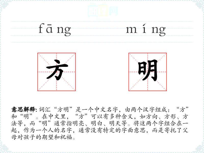 词汇“方明”是一个中文名字,由两个汉字组成:“方”和“明”。在中文里,“方”可以有多种含义,如方向、方形、方法等,而“明”通常指明亮、明白、明天等。将这两个字组合在一起,作为一个人的名字,通常没有特定的字面意思,而是寄托了父母对孩子的期望和祝福。