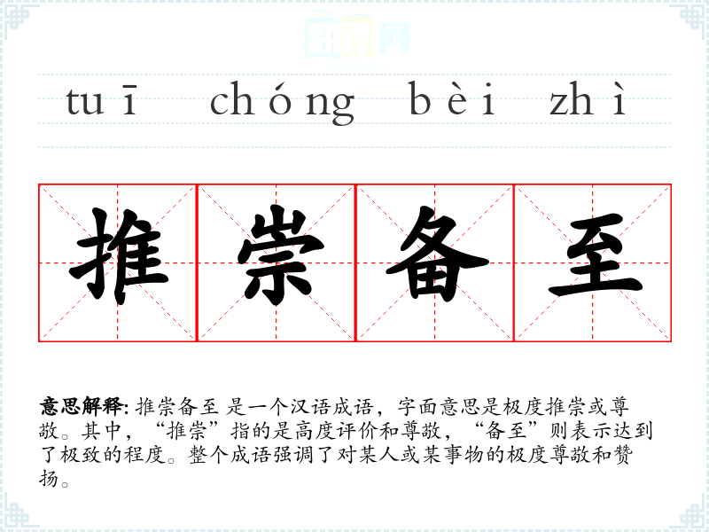 推崇备至 是一个汉语成语,字面意思是极度推崇或尊敬。其中,“推崇”指的是高度评价和尊敬,“备至”则表示达到了极致的程度。整个成语强调了对某人或某事物的极度尊敬和赞扬。