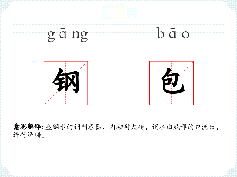 盛钢水的钢制容器,内砌耐火砖,钢水由底部的口流出,进行浇铸。