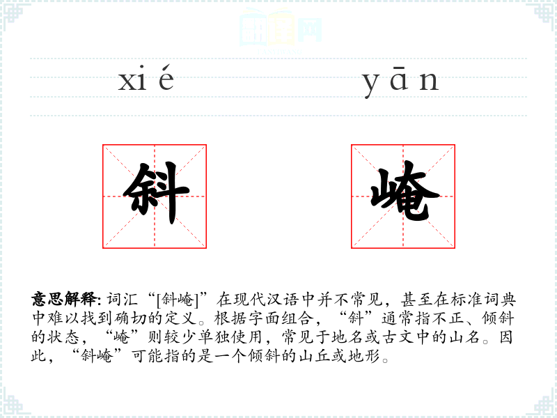 词汇“[斜崦]”在现代汉语中并不常见,甚至在标准词典中难以找到确切的定义。根据字面组合,“斜”通常指不正、倾斜的状态,“崦”则较少单独使用,常见于地名或古文中的山名。因此,“斜崦”可能指的是一个倾斜的山丘或地形。
