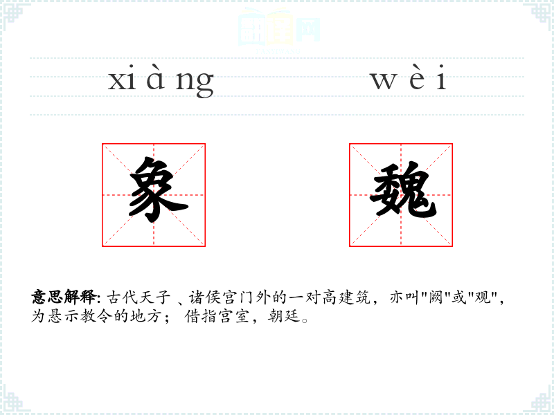 古代天子﹑诸侯宫门外的一对高建筑,亦叫"阙"或"观",为悬示教令的地方; 借指宫室,朝廷。