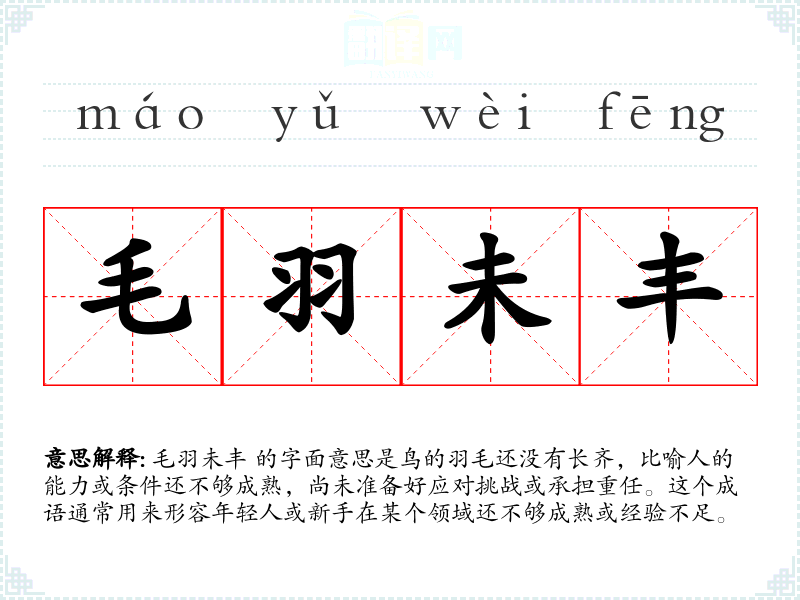 毛羽未丰 的字面意思是鸟的羽毛还没有长齐,比喻人的能力或条件还不够成熟,尚未准备好应对挑战或承担重任。这个成语通常用来形容年轻人或新手在某个领域还不够成熟或经验不足。