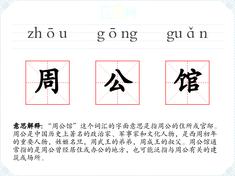在文学作品中,“周公馆”可能被用来象征权威、智慧或历史的厚重感。在口语中,这个词汇可能不太常用,除非是在讨论历史或文化话题时。在专业领域,如历史学或考古学,周公馆可能指的是具体的历史遗址或研究对象。