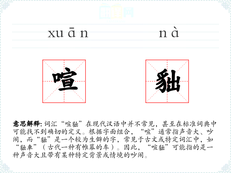 - 理解:“喧貀”是一个富有历史和文化背景的词汇,虽然在现代汉语中不常用,但在描述古代生活和特定场景时具有独特的表达效果。