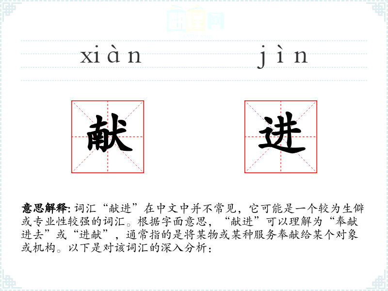 - 理解:“献进”是一个具有深厚历史和文化背景的词汇,虽然在现代日常语言中使用较少,但在特定的语境中仍具有重要的意义。