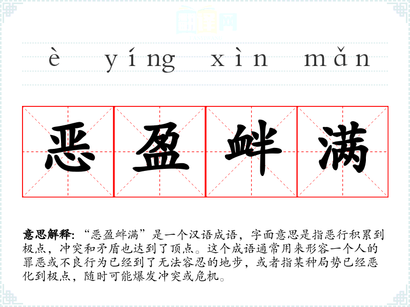 “恶盈衅满”是一个汉语成语,字面意思是指恶行积累到极点,冲突和矛盾也达到了顶点。这个成语通常用来形容一个人的罪恶或不良行为已经到了无法容忍的地步,或者指某种局势已经恶化到极点,随时可能爆发冲突或危机。
