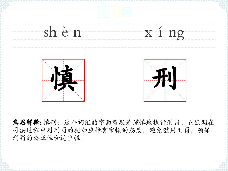 慎刑:这个词汇的字面意思是谨慎地执行刑罚。它强调在司法过程中对刑罚的施加应持有审慎的态度,避免滥用刑罚,确保刑罚的公正性和适当性。