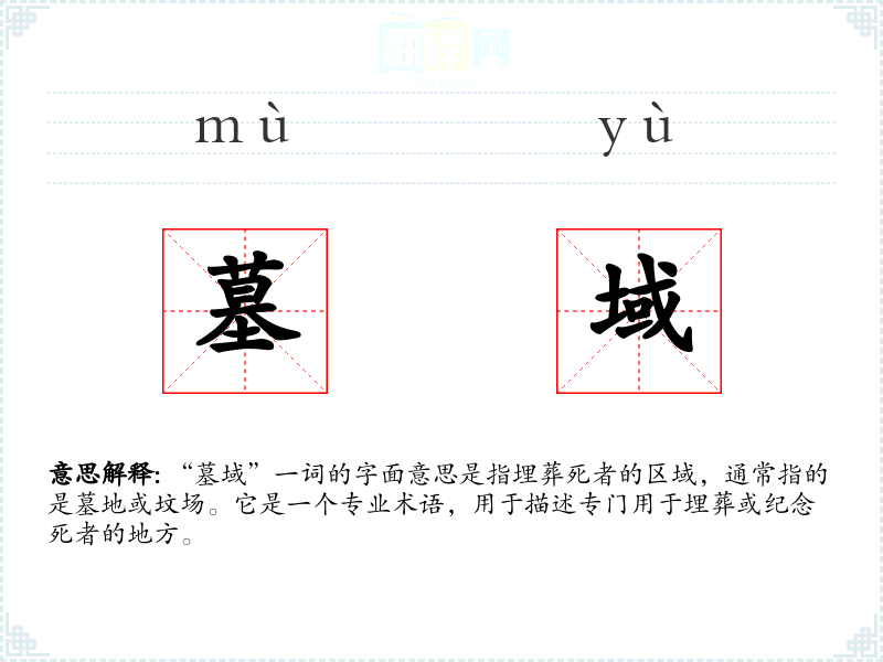 “墓域”一词的字面意思是指埋葬死者的区域,通常指的是墓地或坟场。它是一个专业术语,用于描述专门用于埋葬或纪念死者的地方。