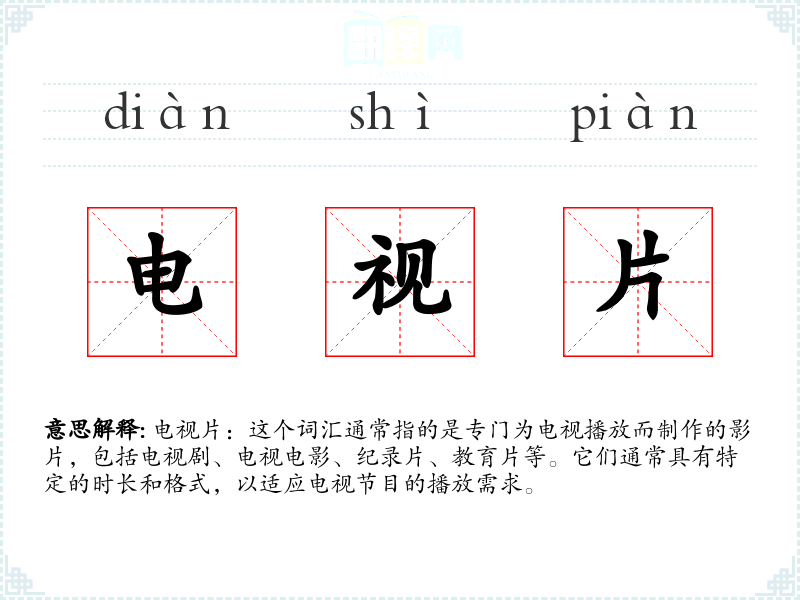 电视片:这个词汇通常指的是专门为电视播放而制作的影片,包括电视剧、电视电影、纪录片、教育片等。它们通常具有特定的时长和格式,以适应电视节目的播放需求。