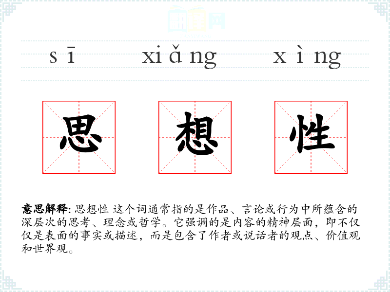 思想性 这个词通常指的是作品、言论或行为中所蕴含的深层次的思考、理念或哲学。它强调的是内容的精神层面,即不仅仅是表面的事实或描述,而是包含了作者或说话者的观点、价值观和世界观。