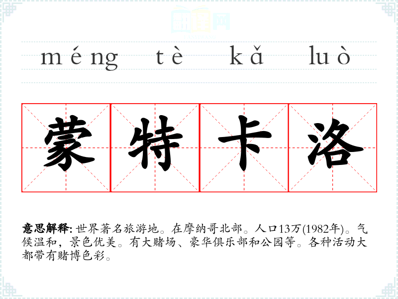 世界著名旅游地。在摩纳哥北部。人口13万(1982年)。气候温和,景色优美。有大赌场、豪华俱乐部和公园等。各种活动大都带有赌博色彩。