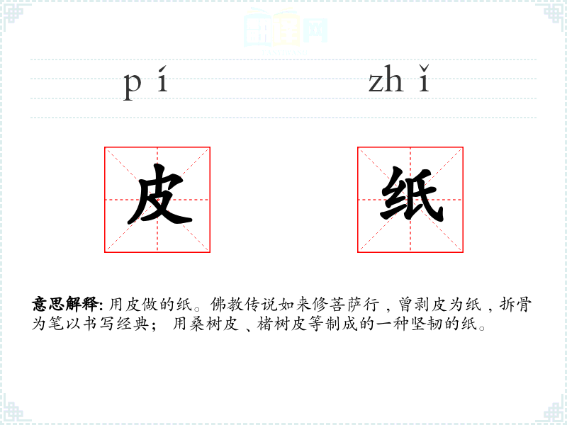 用皮做的纸。佛教传说如来修菩萨行﹐曾剥皮为纸﹐拆骨为笔以书写经典; 用桑树皮﹑楮树皮等制成的一种坚韧的纸。