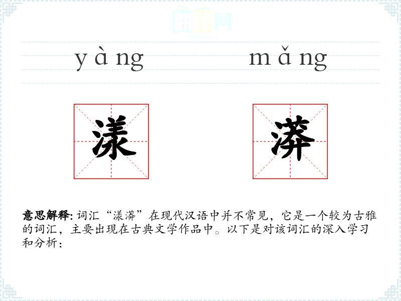 词汇“漾漭”在现代汉语中并不常见,它是一个较为古雅的词汇,主要出现在古典文学作品中。以下是对该词汇的深入学*和分析: