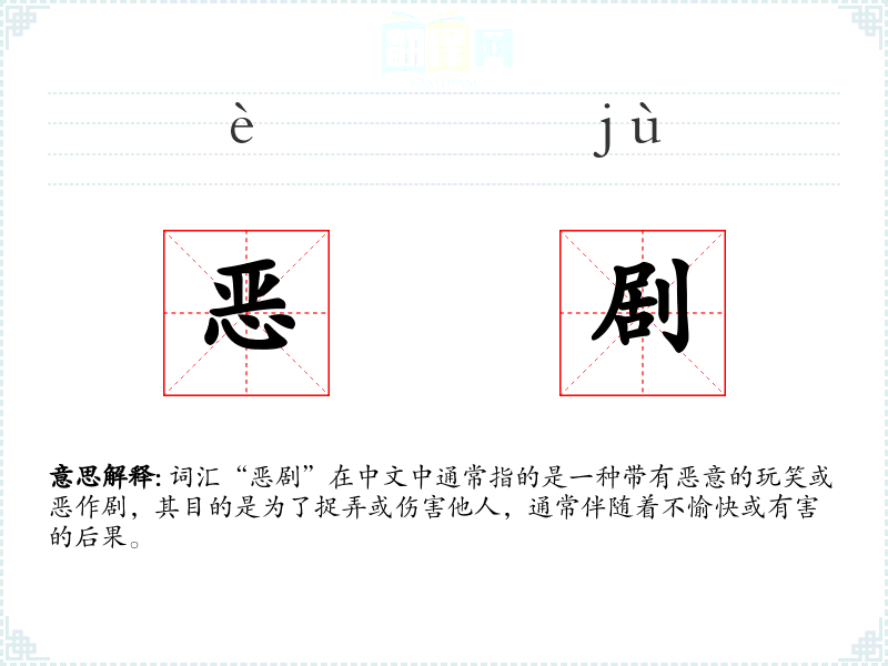 词汇“恶剧”在中文中通常指的是一种带有恶意的玩笑或恶作剧,其目的是为了捉弄或伤害他人,通常伴随着不愉快或有害的后果。