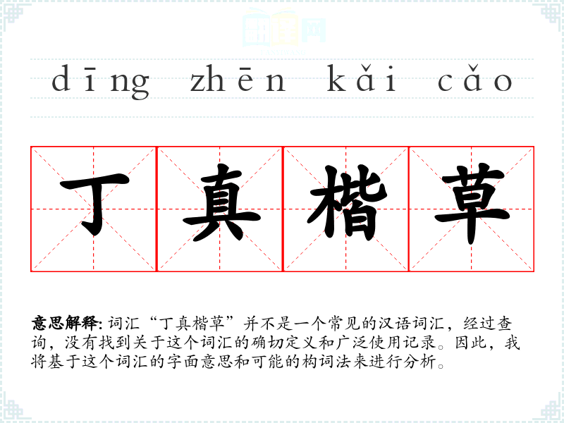 词汇“丁真楷草”并不是一个常见的汉语词汇,经过查询,没有找到关于这个词汇的确切定义和广泛使用记录。因此,我将基于这个词汇的字面意思和可能的构词法来进行分析。
