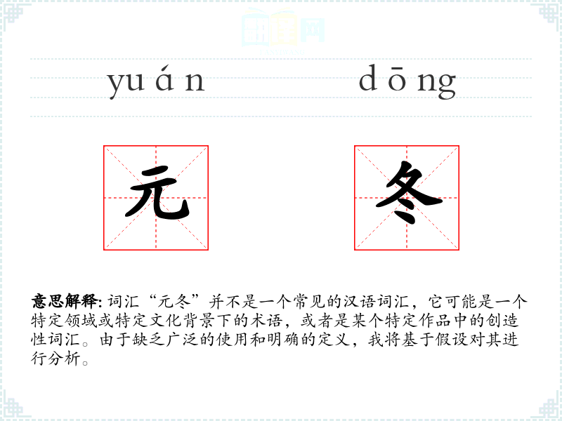 词汇“元冬”并不是一个常见的汉语词汇,它可能是一个特定领域或特定文化背景下的术语,或者是某个特定作品中的创造性词汇。由于缺乏广泛的使用和明确的定义,我将基于假设对其进行分析。