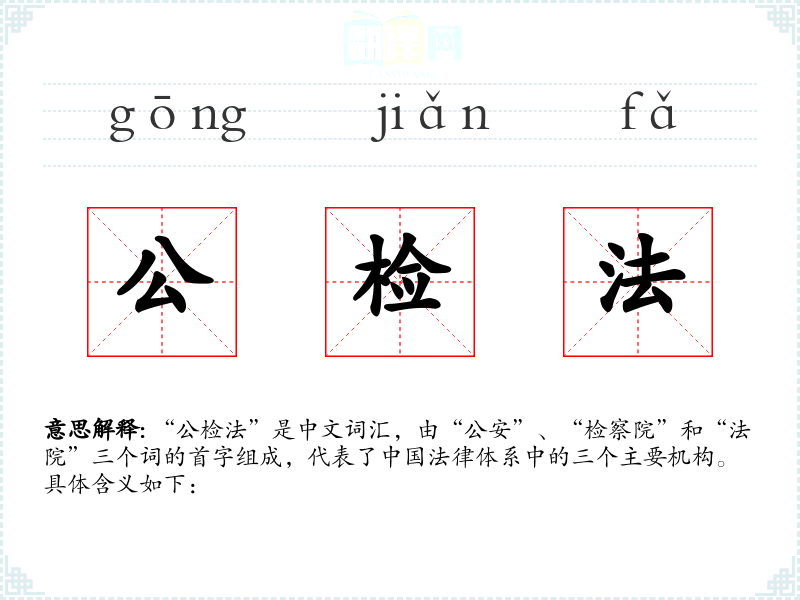 “公检法”是中文词汇,由“公安”、“检察院”和“法院”三个词的首字组成,代表了**法律体系中的三个主要机构。具体含义如下: