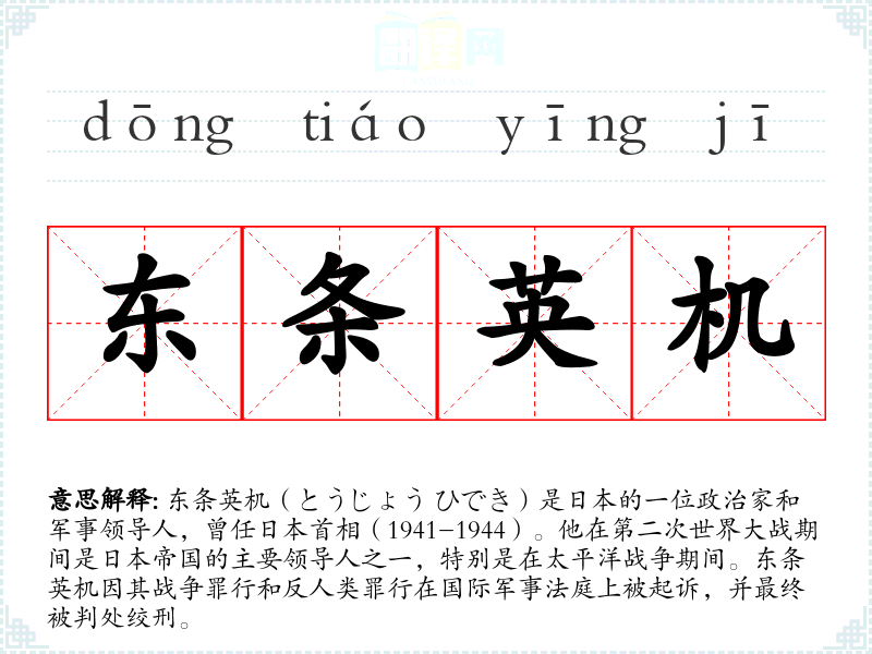 东条英机这个名字是由汉字“东条”和“英机”组成,其中“东条”是姓氏,“英机”是名字。在日语中,“英”通常与英勇、杰出相关,“机”则可能与机器或机会有关。随着时间的推移,这个名字在历史和法律文献中被广泛使用,成为了一个具有特定历史意义的词汇。