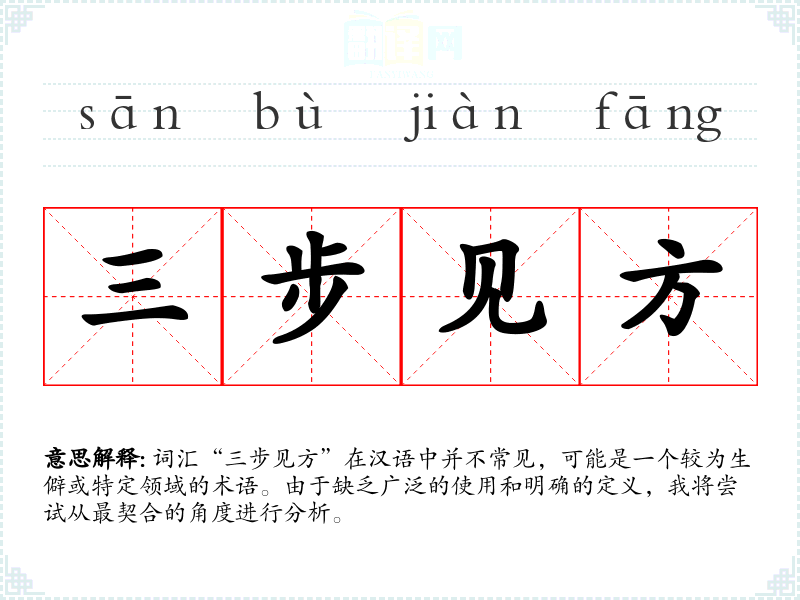 词汇“三步见方”在汉语中并不常见,可能是一个较为生僻或特定领域的术语。由于缺乏广泛的使用和明确的定义,我将尝试从最契合的角度进行分析。