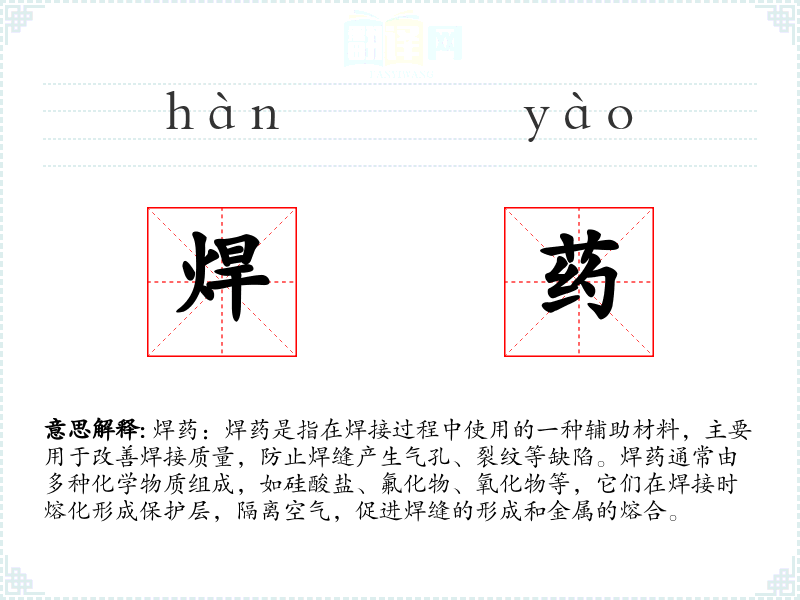 同义词:焊剂、焊料、焊接助剂 反义词:无直接反义词,但可以考虑“污染物”作为对比,因为焊药的作用是减少或避免污染。
