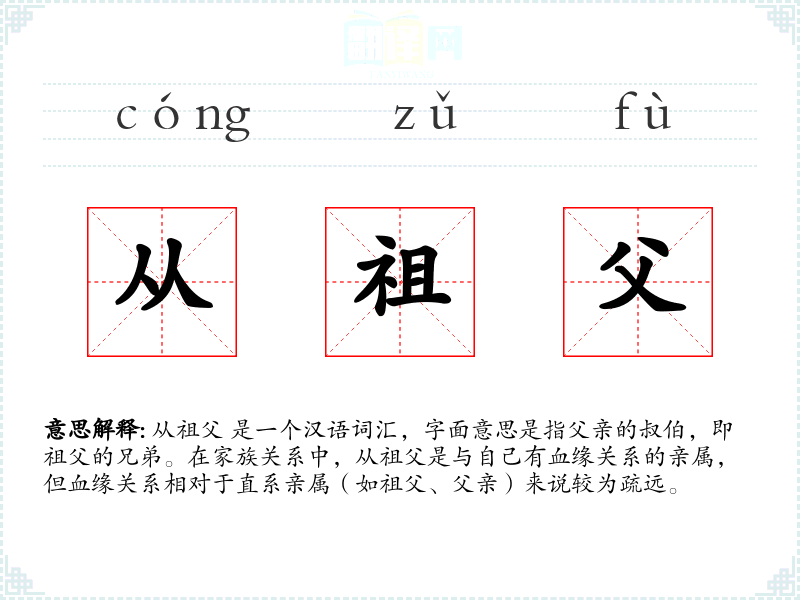 从祖父 是一个汉语词汇,字面意思是指父亲的叔伯,即祖父的兄弟。在家族关系中,从祖父是与自己有血缘关系的亲属,但血缘关系相对于直系亲属(如祖父、父亲)来说较为疏远。