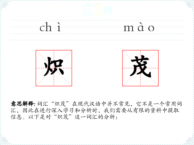 词汇“炽茂”在现代汉语中并不常见,它不是一个常用词汇,因此在进行深入学习和分析时,我们需要从有限的资料中提取信息。以下是对“炽茂”这一词汇的分析: