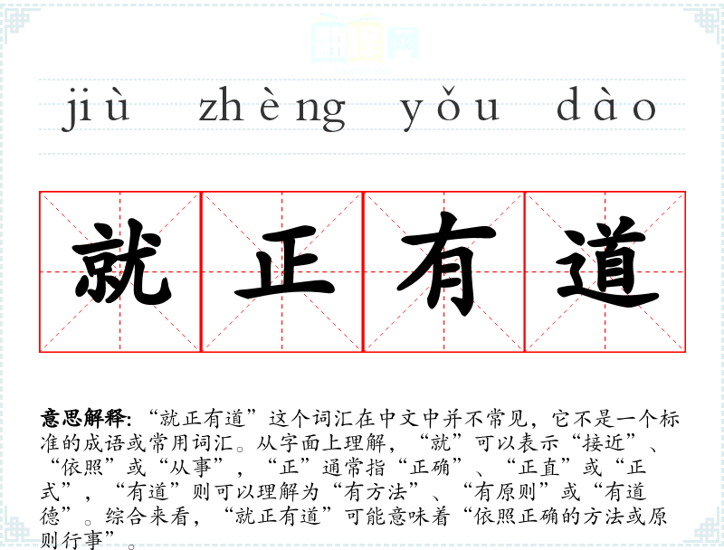“就正有道”这个词汇在中文中并不常见,它不是一个标准的成语或常用词汇。从字面上理解,“就”可以表示“接近”、“依照”或“从事”,“正”通常指“正确”、“正直”或“正式”,“有道”则可以理解为“有方法”、“有原则”或“有道德”。综合来看,“就正有道”可能意味着“依照正确的方法或原则行事”。
