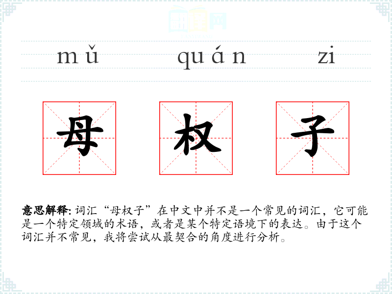 词汇“母权子”在中文中并不是一个常见的词汇,它可能是一个特定领域的术语,或者是某个特定语境下的表达。由于这个词汇并不常见,我将尝试从最契合的角度进行分析。