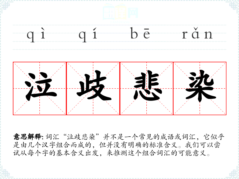 词汇“泣歧悲染”并不是一个常见的成语或词汇,它似乎是由几个汉字组合而成的,但并没有明确的标准含义。我们可以尝试从每个字的基本含义出发,来推测这个组合词汇的可能意义。