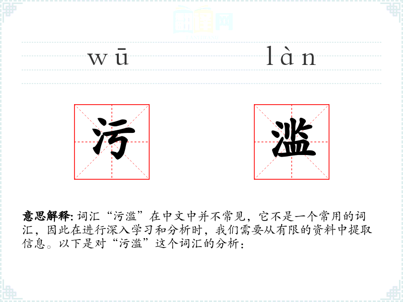 词汇“污滥”在中文中并不常见,它不是一个常用的词汇,因此在进行深入学习和分析时,我们需要从有限的资料中提取信息。以下是对“污滥”这个词汇的分析: