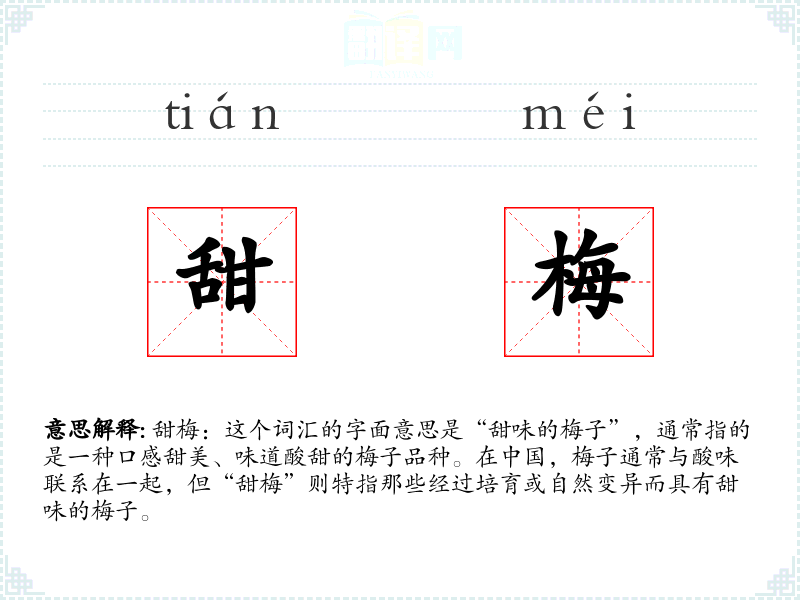 “甜梅”这个词源于汉语,其中“甜”表示甜味,“梅”指梅子。随着人们对水果口味的追求,甜梅的培育和改良成为可能,使得这个词在现代汉语中更为常见。