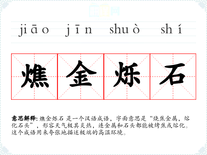 燋金烁石 是一个汉语成语,字面意思是“烧焦金属,熔化石头”,形容天气极其炎热,连金属和石头都能被烤焦或熔化。这个成语用来夸张地描述极端的高温环境。