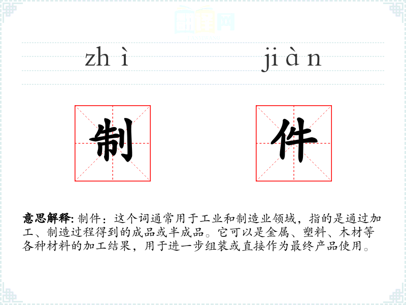 制件:这个词通常用于工业和制造业领域,指的是通过加工、制造过程得到的成品或半成品。它可以是金属、塑料、木材等各种材料的加工结果,用于进一步组装或直接作为最终产品使用。